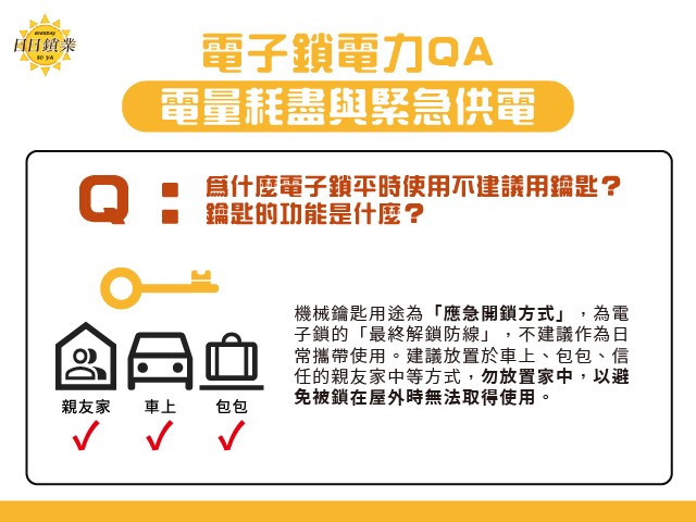 因為電子鎖的機械鑰匙用途為「應急開鎖方式」,為電子鎖的「最終防線」,故不建議作為日常使用。