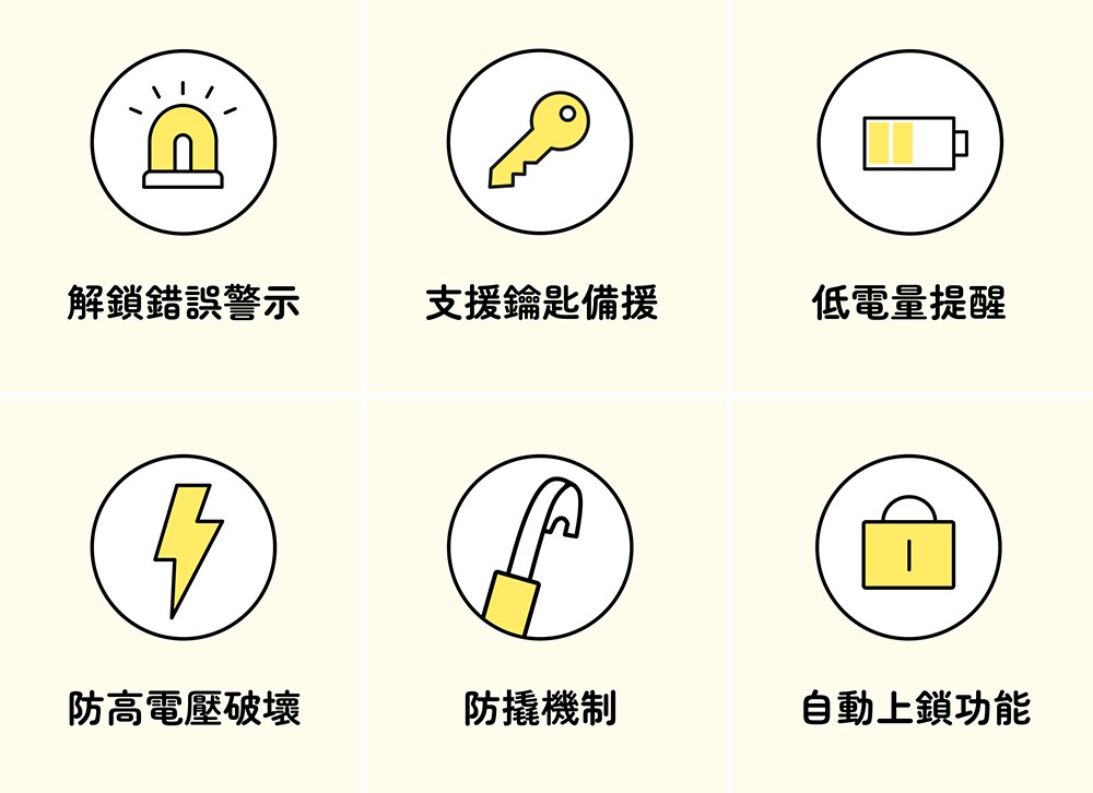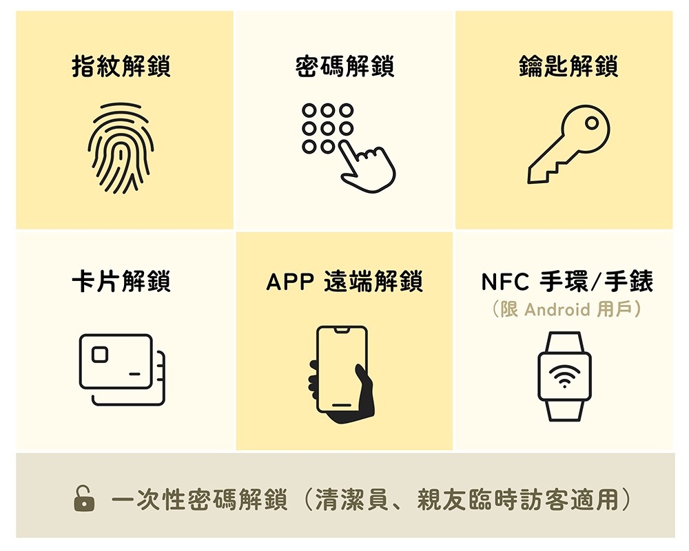 ◎指紋 ◎卡片 ◎密碼 ◎鑰匙 ◎遠端APP ◎NFC 手環/手錶 (限 Android 用戶)