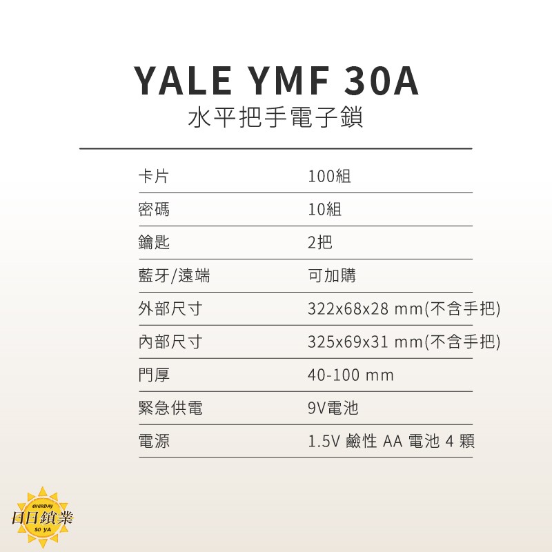 YALE耶魯 水平把手電子鎖-YMF 30A